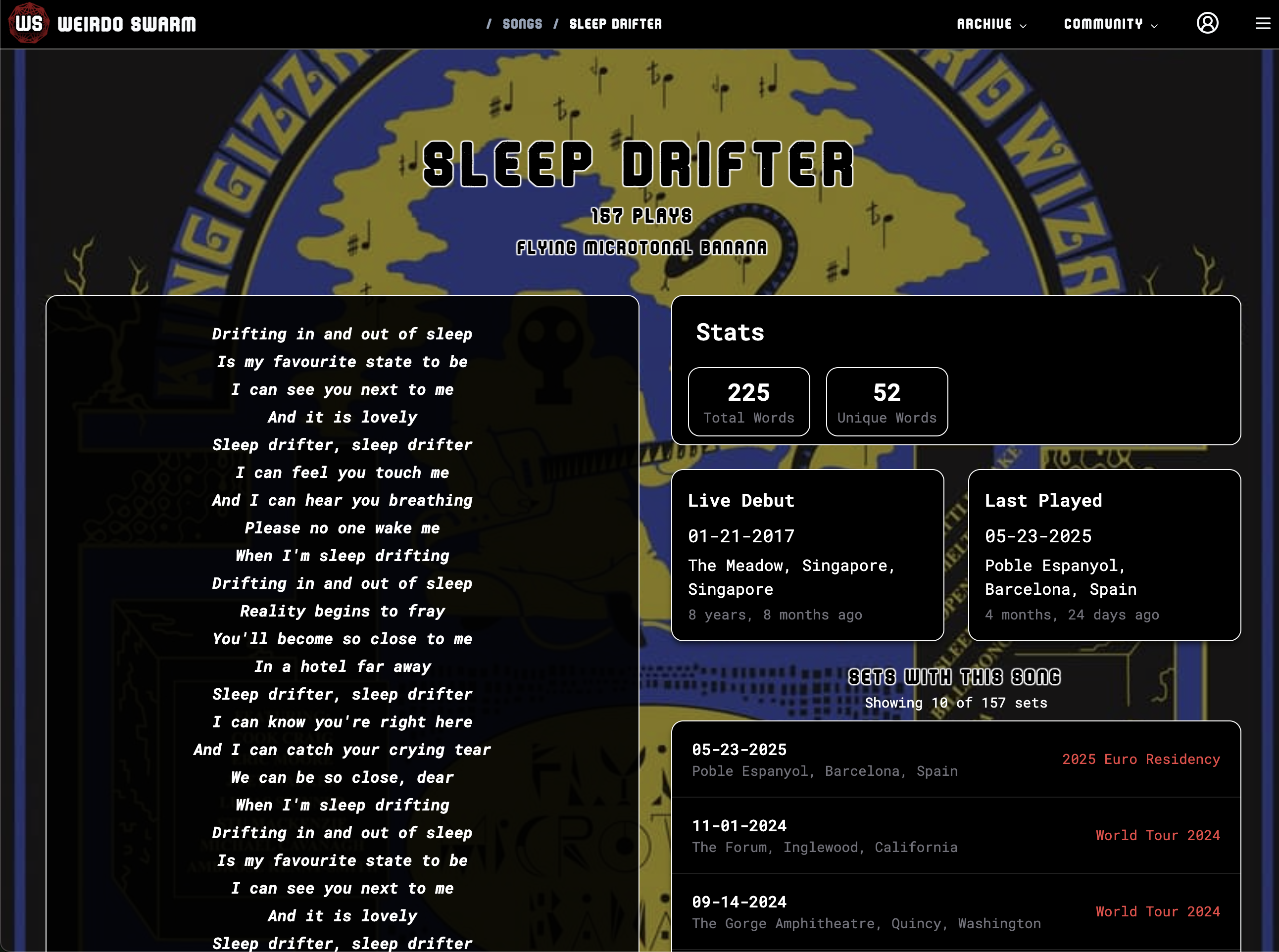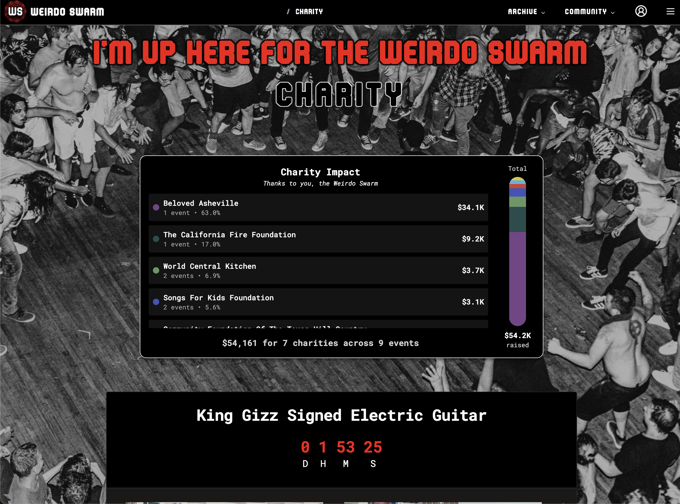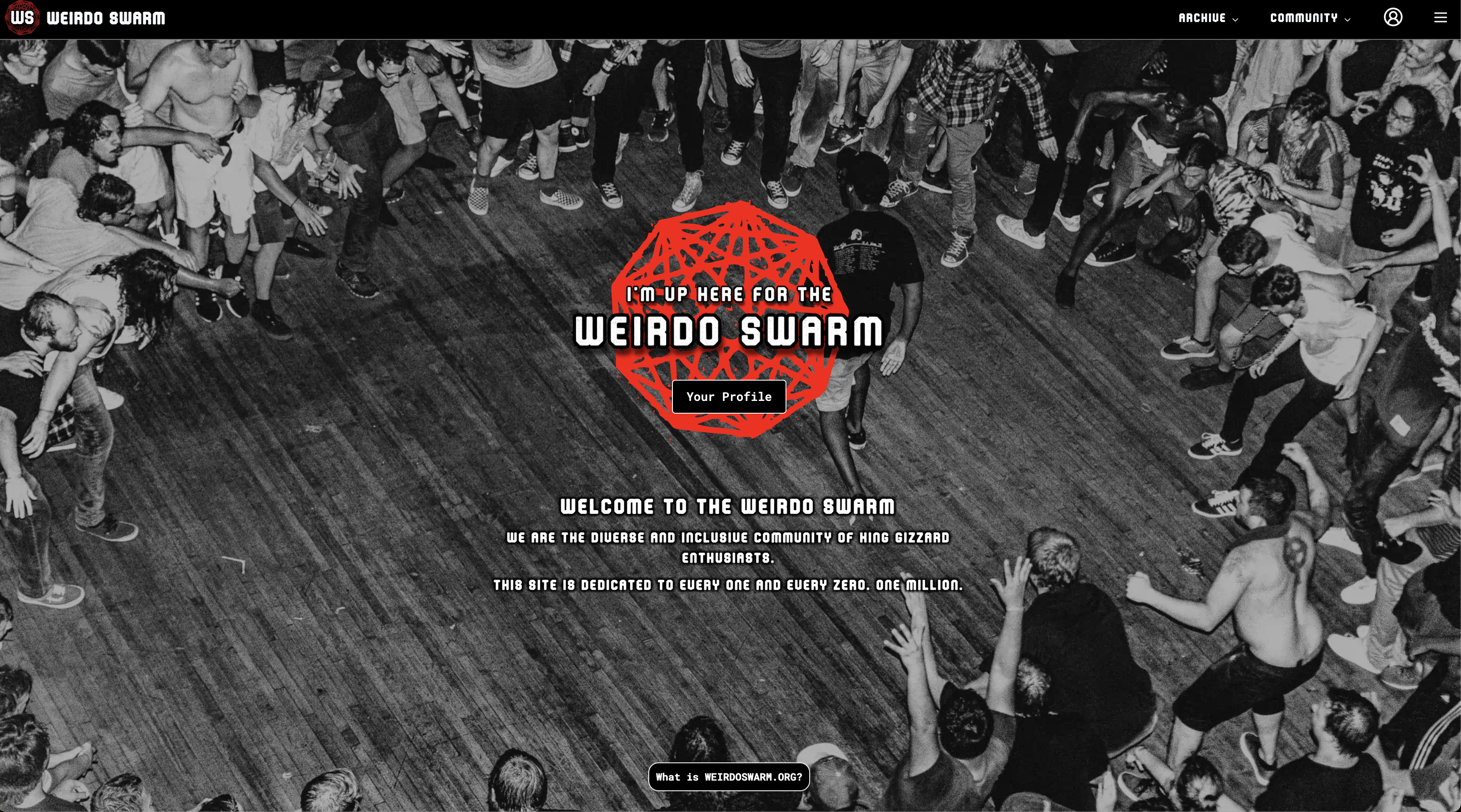 This community site was made for the community of fans supporting the band King Gizzard and the Lizard Wizard. It features archives of all their songs, lyrics, live performances, and posters. It also includes community aspects like an archive of bootleg art creators and group fan meetups. Users can create a profile, determine, add, and share their personal stats, and leave show reviews. This site has over 3,000 established users, and helps facilitate an annual gift exchange - Gizzmas, which reaches around 500 applicants internationally. WEIRDOSWARM.ORG also facilitates charity raffles and live auctions, which have raised over $55,000 for important charities like Beloved Asheville, World Central Kitchen, Songs for Kids Foundation, and the California Fire Foundation.