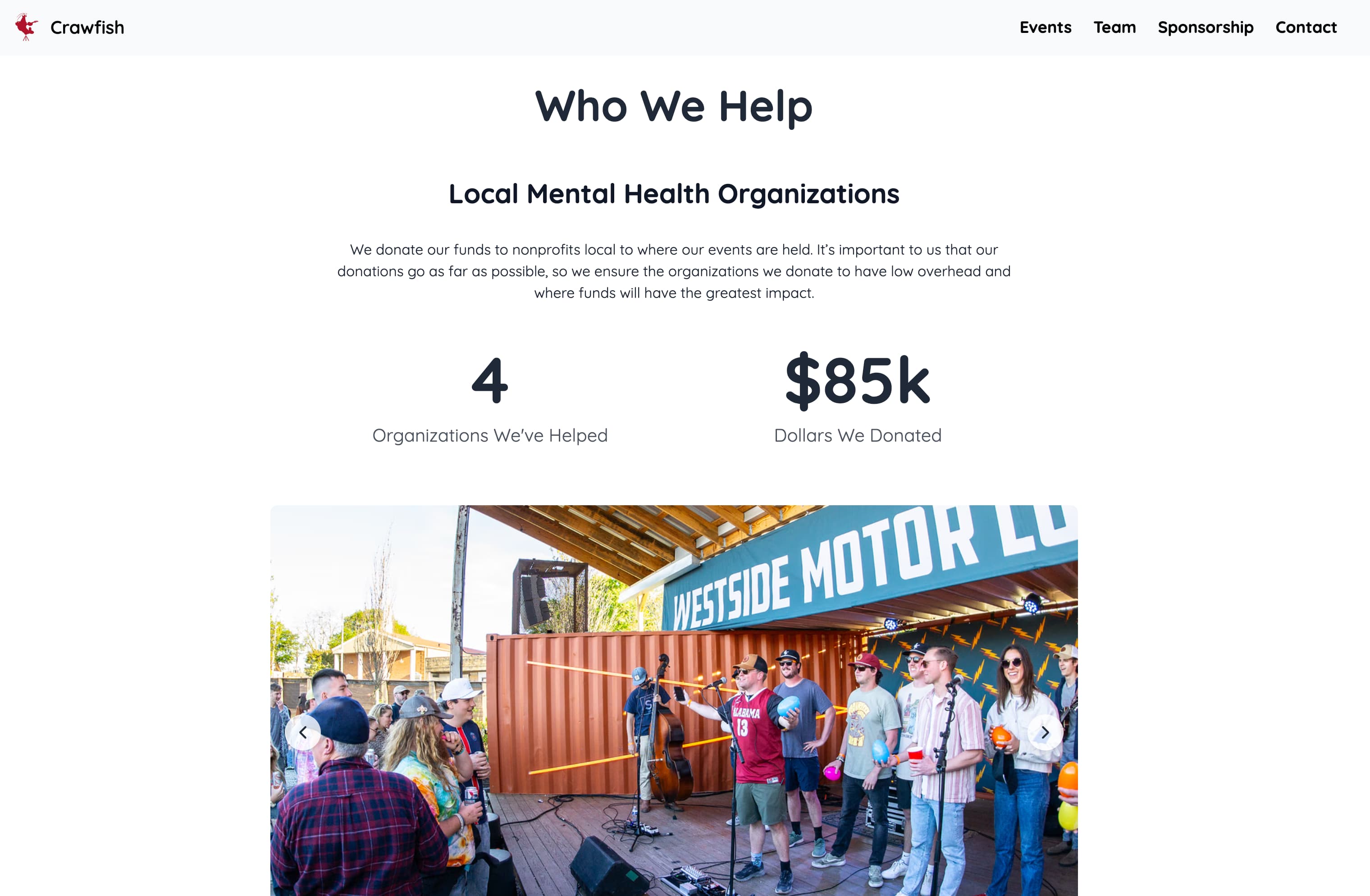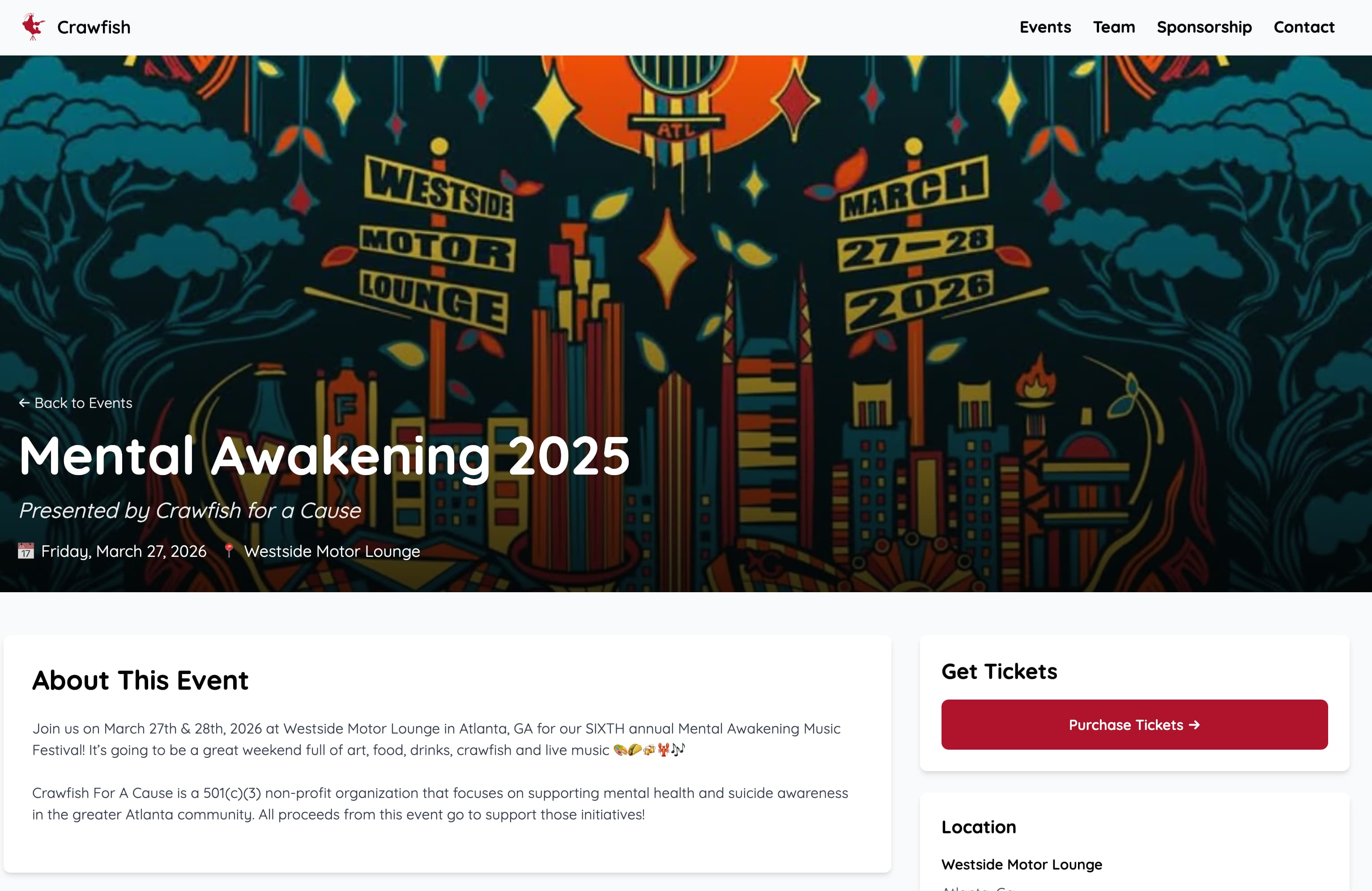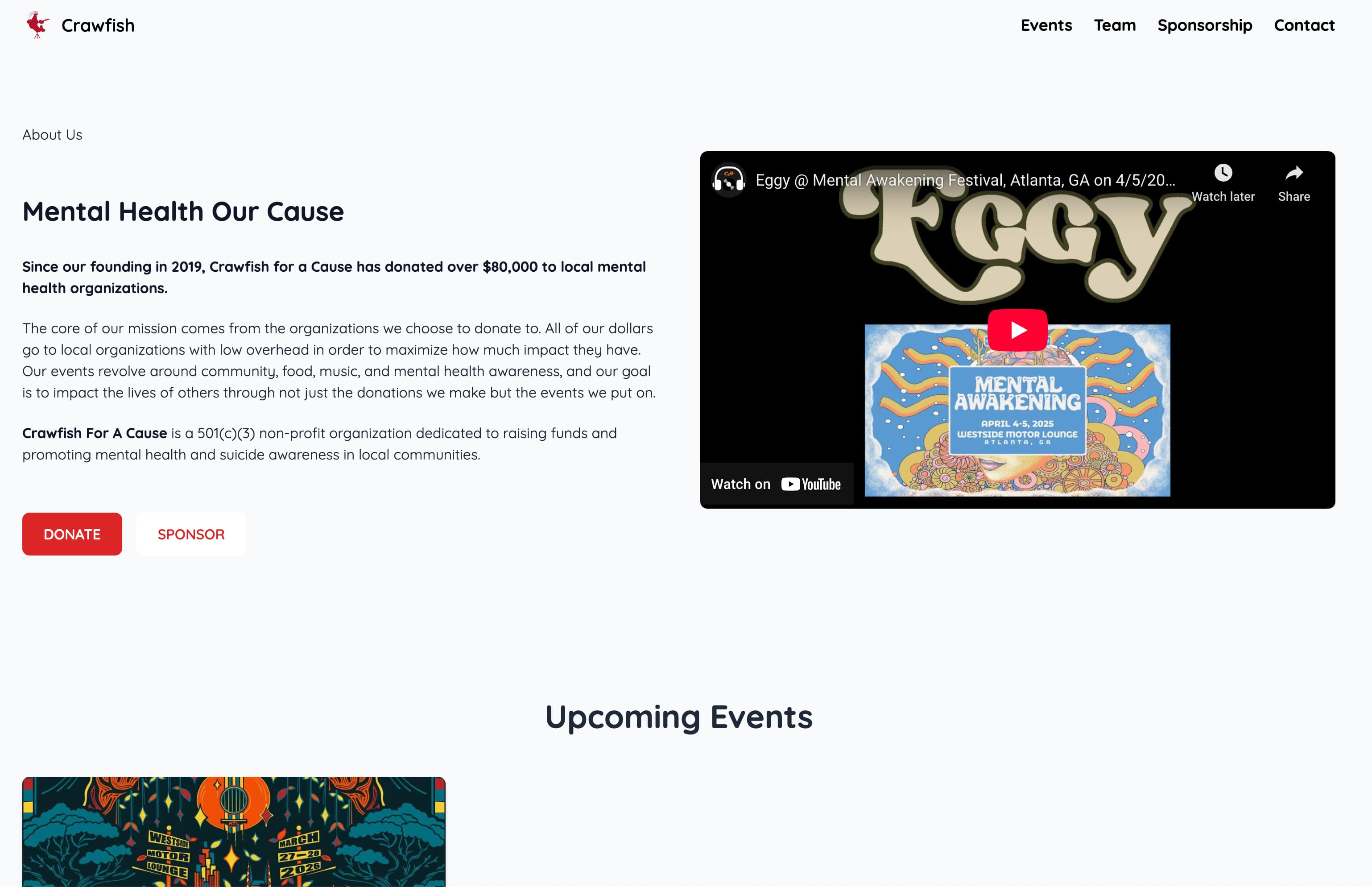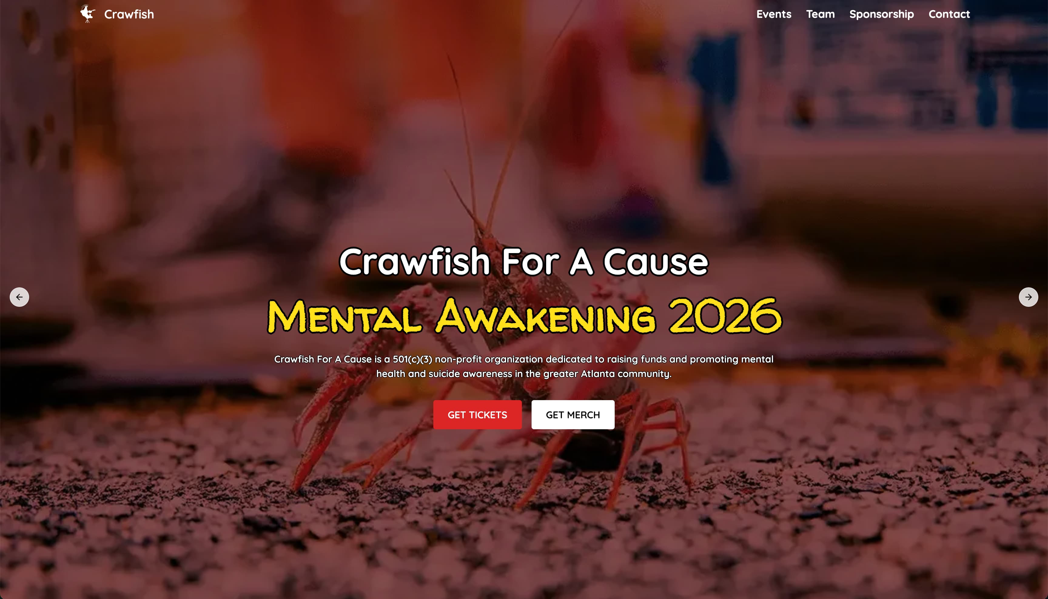 A website for the 501(c)(3) Charity Crawfish for a Cause - who hosts events and fundraises for Atlanta mental health initiatives.