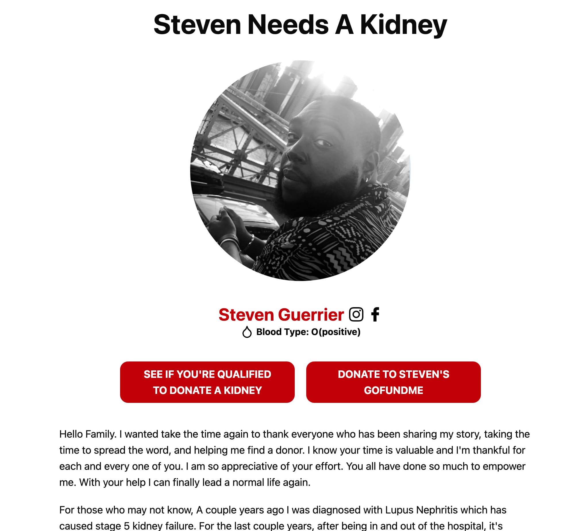 This gratis website was created to help Steven easily share information about his health circumstances, and find a kidney donor.